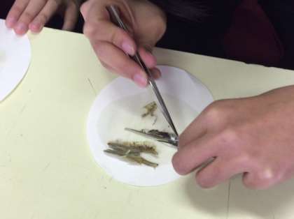 5時間目、相互参観授業(3年理科)が行われました。「自然界のつり合い」の単元です。身近にある煮干し(カタクチイワシ)から食物連鎖を考えていきます。マグロやカツオに食べられるカタクチイワシは何を食べているのかを実験を通して観察します。湯で柔らかくなったカタクチイワシを解剖して胃の中を調べました。何が見えたのでしょうか?