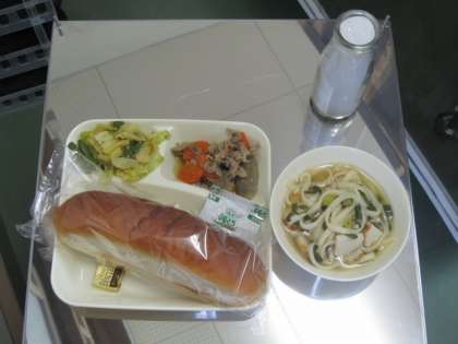 2月9日(木)本日の給食は、豚肉とごぼうの煮物、なにわうどん、キャベツと三度豆のごまあえ です。大型コッペパンとバターがつきます。うどんには、とろろ昆布がつきます。