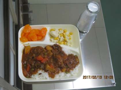 2月13日(月)本日の給食は、ハヤシライス、カリフラワーとコーンのピクルス、みかん(缶)です。