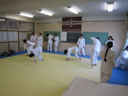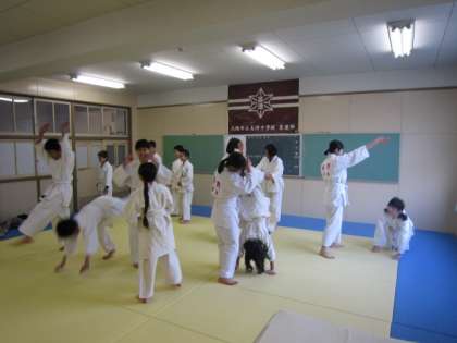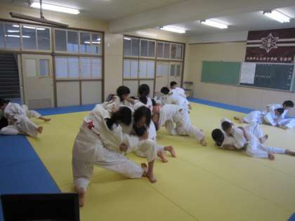 校内では、柔道を実施。まずは準備運動から開始しました。