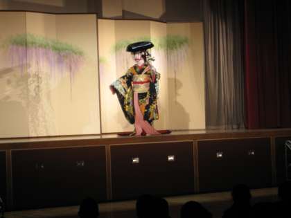 歌舞伎舞踊『藤娘』です。男性が自らお化粧をほどこし、女方に変身して演じます。