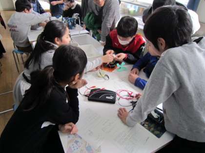 果物を使って、電気を発生させる授業です。れもんや大根などを輪切りしてプロペラやLEDをつけてみました。