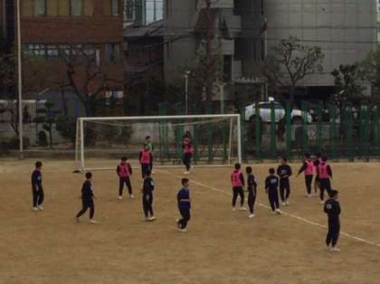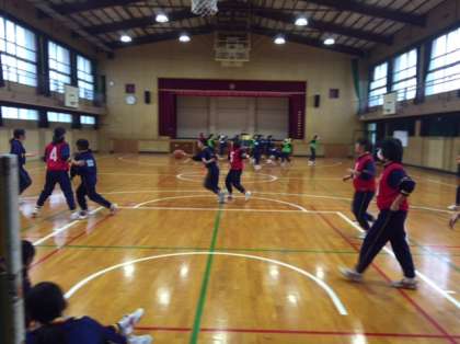 3年体育の授業の様子です。女子はバスケットボール、男子はサッカーのゲームをしています。グランドはかなりの強風です。