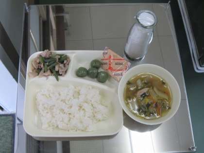 3月1日(水)本日の給食は、豚肉とれんこんの炒め煮、すまし汁、きな粉よもぎだんご です。