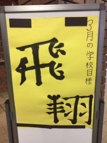 3月の学校目標が玄関ピロティに掲示されています。「飛翔」です。三年生は高校生をはじめとする次のステップへ、一・二年生は次の学年へと大きく羽ばたいてください。3月はまさに「飛翔」の準備の月です。頑張りましょう。
