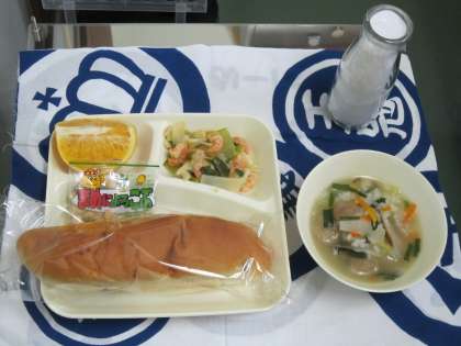 3月7日(火)本日の給食は、えびとチンゲンサイの炒め物、中華がゆ、はっさく、豆こんぶ です。レーズンコッペパンがつきます。