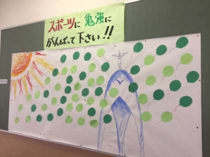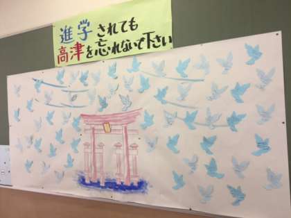 1・2年生一人一人が、鳩や風船の形をした紙に思い思いのメッセージを書き込んでいます。もうすぐ3年生ともお別れです。