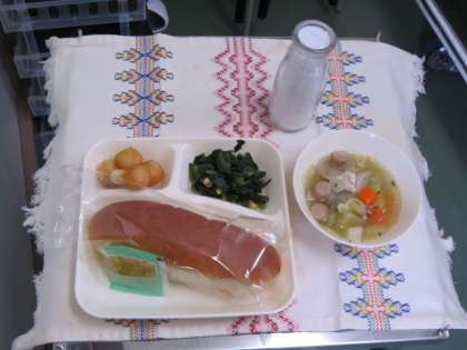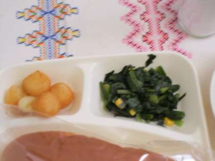 3月13日(月)本日の給食は、鶏肉と野菜のスープ煮、ほうれん草とコーンのソテー、あげポテトもち です。大型コッペパンとりんごジャムがつきます。
