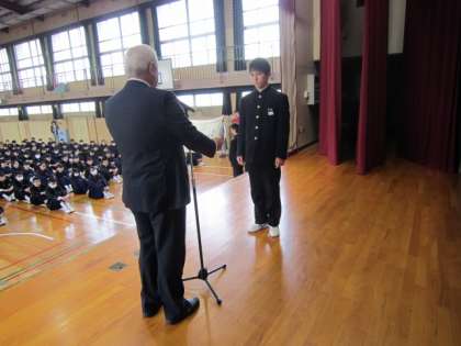 先日、教育長表彰を受賞した生徒の伝達を行いました。ゴルフの全国大会で2位の成績です。大変すばらしい成績です。