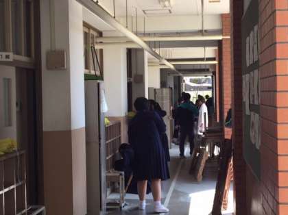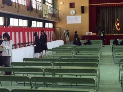 入学式の準備を行いました。新一年生の入る教室・廊下なども係生徒と共に清掃しました。