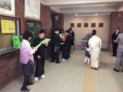 続々と新入生が保護者の方と登校してきます。クラス分けのプリントを見ながらワクワクしているのでしょうか。そして、いよいよ入場です。