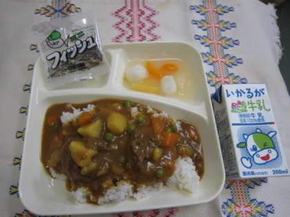 年度初めの給食は入学祝いメニューのカツカレーライス、フルーツ白玉、ミニフィッシュです。