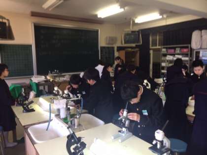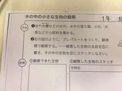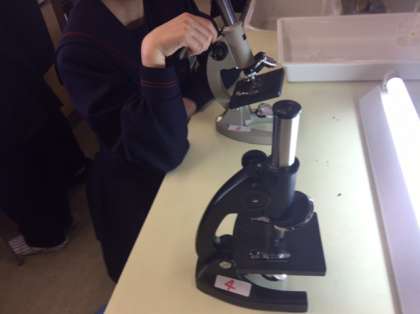 1年理科の授業の様子です。理科室で「水の中の小さな生物の観察」を行っています。顕微鏡を使っています。何が見えたのかな?