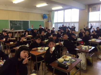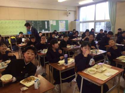本日の給食風景です。皆さん、美味しそうに食べていますね〜。写真は1年1組と2組です。