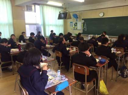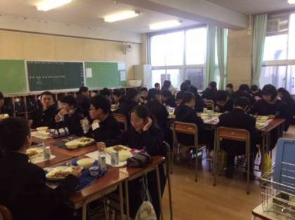 いい顔して食べていますね〜。皆さん、残さずに食べましょう。写真は1年3組と4組の様子です。