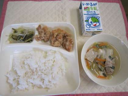 今日は、みんなが大好きな鶏肉のからあげです。スープもお野菜がたくさん入っていておいしかったですね。
