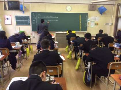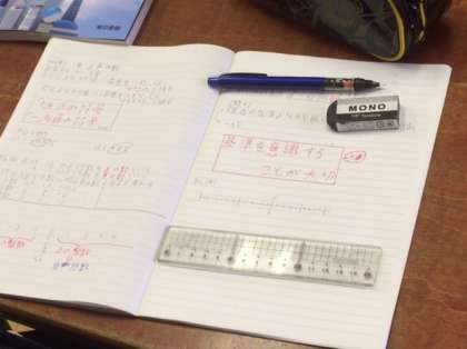 1年数学の授業の様子です。「しっかりと復習することが大事です。さあ、前の時間は何を勉強しましたか?」との声かけに多くの生徒が手を上げました。いい感じですね〜。今日は数直線を使って正の数・負の数の学習です。