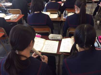 2年音楽の授業の様子です。リコーダーの練習のあと、発声練習をし、「翼をください」を歌いました。