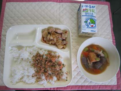焼きとりはしょうががよく効いておいしかったですね。また、紅ざけそぼろはご飯によくあい、食がすすみますね。ごちそうさまでした。