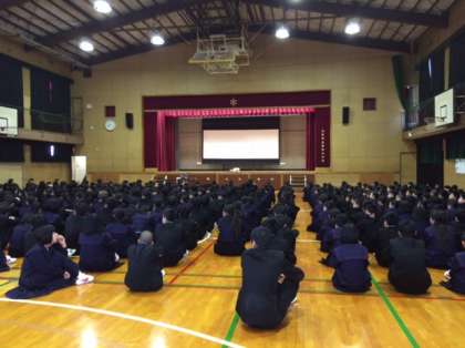 4月24日、全校集会を行いました。1時間目に実施する「携帯安全教室」に関連して、校長先生から、携帯などの扱いをあやまると健康や生活にどんな影響があるのか、例をあげて話がありました。視力低下や睡眠障害などにつながり、生活面では学力低下や家族・友人との関係悪化などを引き起こしていく例もあるという内容でした。最後に、携帯自体は何も悪い物ではなく、非常に便利な反面、使い方を間違えないようにすることが大事だという話がありました。