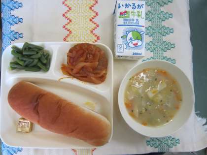 今日の献立は煮こみハンバーグ、コーンスープ、三度豆のサラダ、コッペパン、バターです。