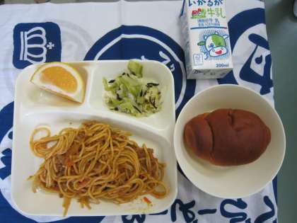 本日の献立はカレースパゲティ、キャベツのひじきドレッシング、半減黒糖ロール、河内ばんかんです。