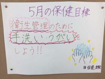 保健室前の廊下掲示板に5月の保健目標が掲示されています。「衛生管理のために手洗いうがいをしよう」です。皆さん、外出後や食事前などはしっかりと手洗いをしましょう。