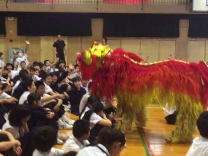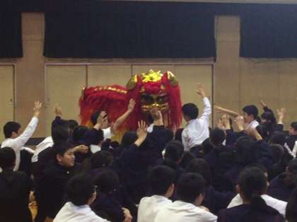 獅子舞は会場内を歩き回って、生徒たちを噛みにいきます。噛まれた人はいいことがあるようです。みんな手をあげて呼んでいます。