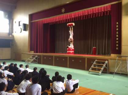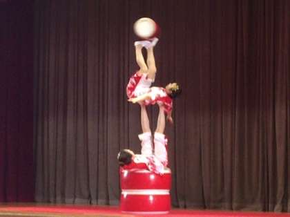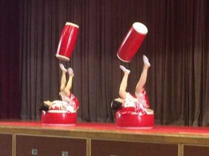 次は太鼓を脚で操っています。人の上で倒立して太鼓を回しています。