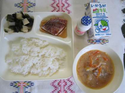 本日の献立は赤魚のしょうゆだれかけ、みそ汁、わかたけ煮、はっ酵乳でした。