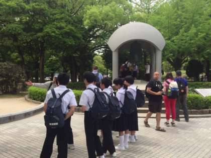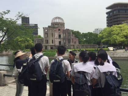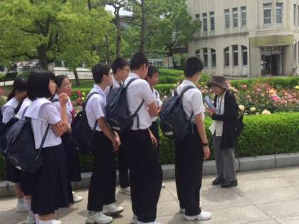原爆ドームの前で学級写真を撮影した後、グループに分かれてガイドさんの説明による平和学習です。