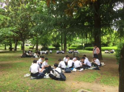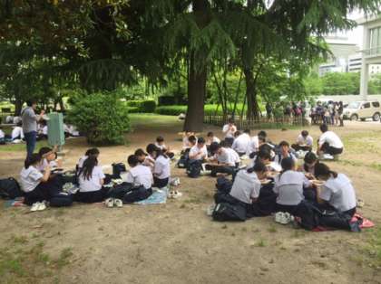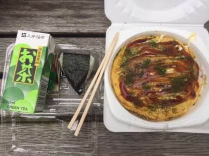 今日の昼食は「お好み焼き弁当」です。温かいお好み焼きとおにぎりがついています。焼きそばが入っているのでモダン焼きかな。