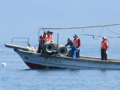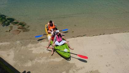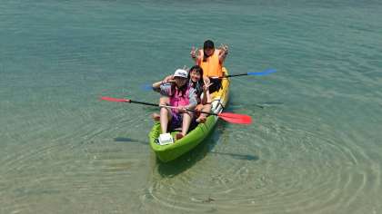 刺し網をあげているグループ、カヌーで海に出ているグループをみつけました。気温が上がってきましたので気持ち良さそうですね〜。