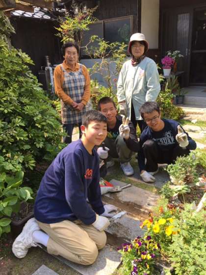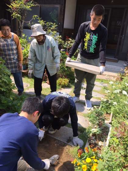 庭の敷石をはめる作業をしています。おばあちゃんが嬉しそうに見ていますねぇ。いい仕事をしました。