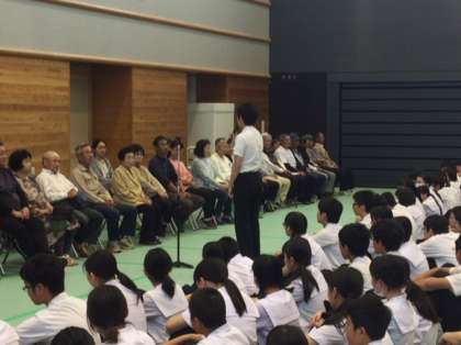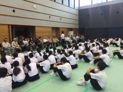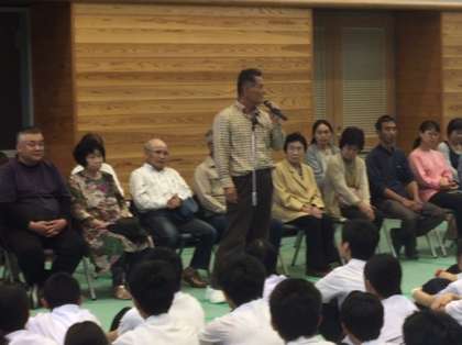 最終日、防災センターにおいて民泊でお世話になった方々とのお別れ式を行われました。生徒代表・校長先生のお礼のあいさつの後、民家の代表の方からあいさつがありました。