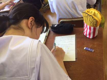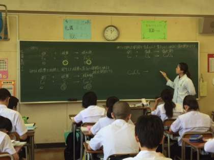 2年理科の授業の様子です。物質どうしのむすびつき、化合についての学習です。鉄と硫黄、銅と硫黄などがむすびついたら何になるかを順番に答えていきます。