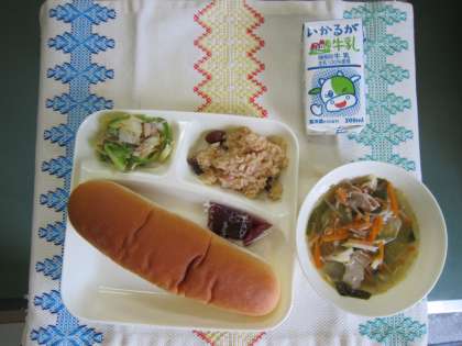 給食には珍しい中華おこわでした。おこわは、もち米を蒸したご飯のことです。もちもちとした食感と甘みが特徴で、強い飯と書いて「強飯」とも呼ばれます。今日はもちもちとした食感の中華おこわを味わって食べましょう。