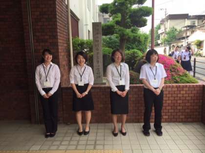 朝の挨拶運動に教育実習生も参加しています。皆さん、気持ちよく、大きな声で挨拶しましょう。