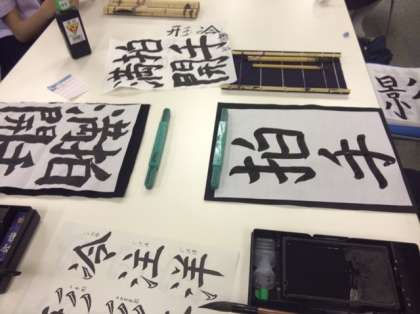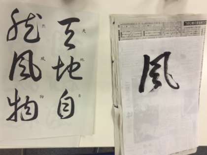図書室で書道部が活動しています。しっかり練習して文化祭に展示してください。
