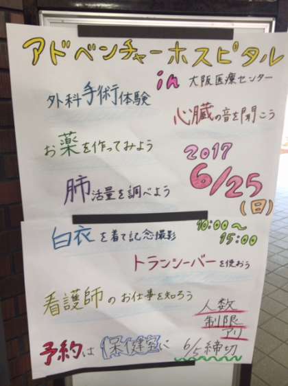 玄関ピロティに「アドベンチャーホスピタルin大阪医療センター」というポスターが掲示されています。様々な医療体験ができるようです。テスト前ではありますが、興味のある人は応募してみましょう。