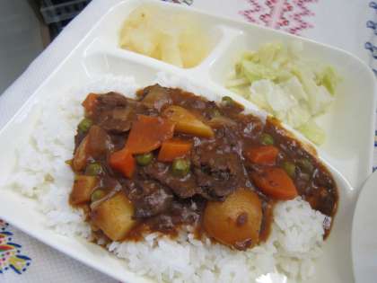 本日の献立はハヤシライス、キャベツのゆずドレッシング、和なし(缶)です。