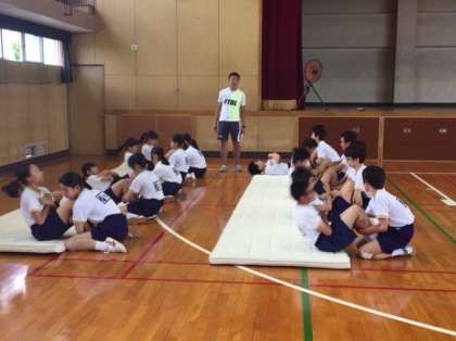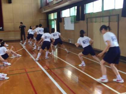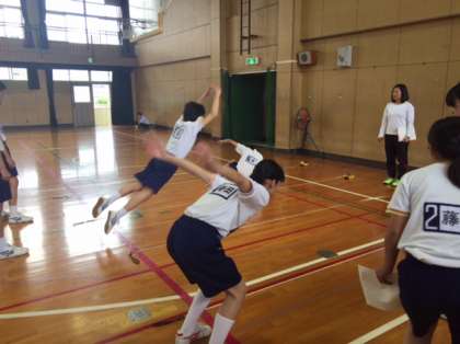 2年体育の授業の様子です。6月9日(金)のスポーツテスト本番に向けて、反復横とび・上体起こし・立ち幅跳びの練習をしています。