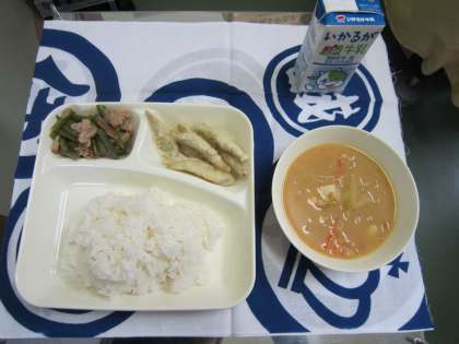 本日の献立はいわしのてんぷら、みそ汁、豚肉と三度豆のいためものです。