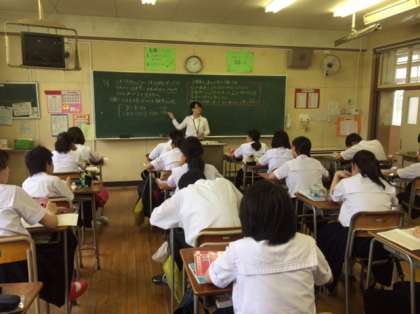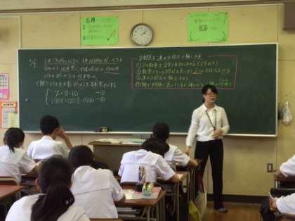 数学の実習生が授業をしています。「文章題をいろいろな解法で解いてみよう」ということで、連立方程式で解く手順を学習し、問題を解いています。