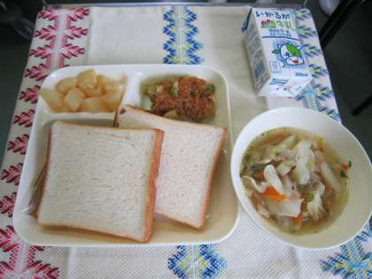 本日の献立はカレードリア、キャベツのスープ、食パン2枚、白桃(缶)です。