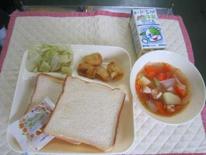 本日の献立は、いかのてんぷら、フレッシュトマトのスープ煮、キャベツのピクルス、食パンです。