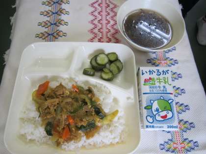本日の献立は和風カレー丼、もずくとオクラのとろり汁、きゅうりの酢のものです。