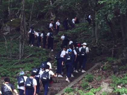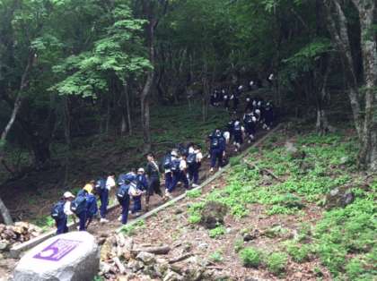 途中、休憩を挟んで頂上目指して再び登りだしました。しんどいけど、励ましあって歩きましょう。