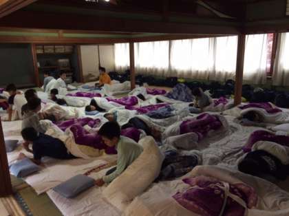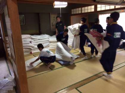 おはようございます。午前7時、起床時間になりました。皆さん、寝起きがいいですね。そして、指示通りテキパキとふとんをたたんでいます。