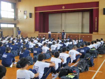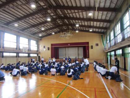 6月19日、待ちに待った67期生の2年生一泊移住です。カバンには、クラスカラーのテープも巻いています。出発式では学年代表から「団結!メリハリ!大切に!」と目標を確認して、元気よく出発しました。